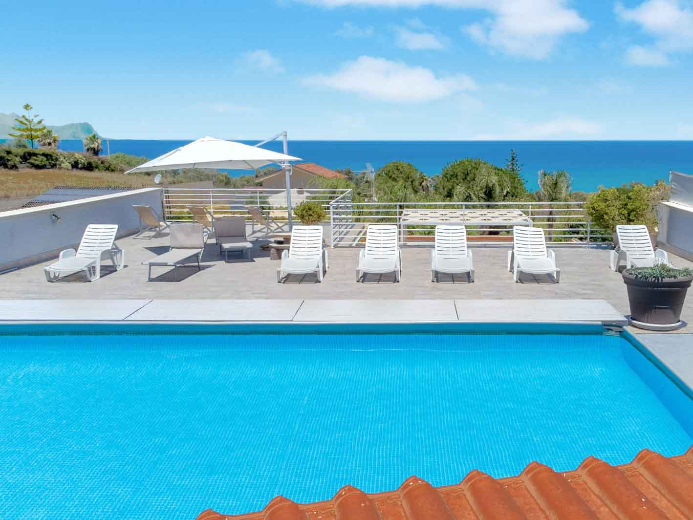 Appartement met een terras, een gemeenschappelijk dakterras en zwembad op slechts enkele minuten rijden van het centrum en het zandstrand van Balestrate.